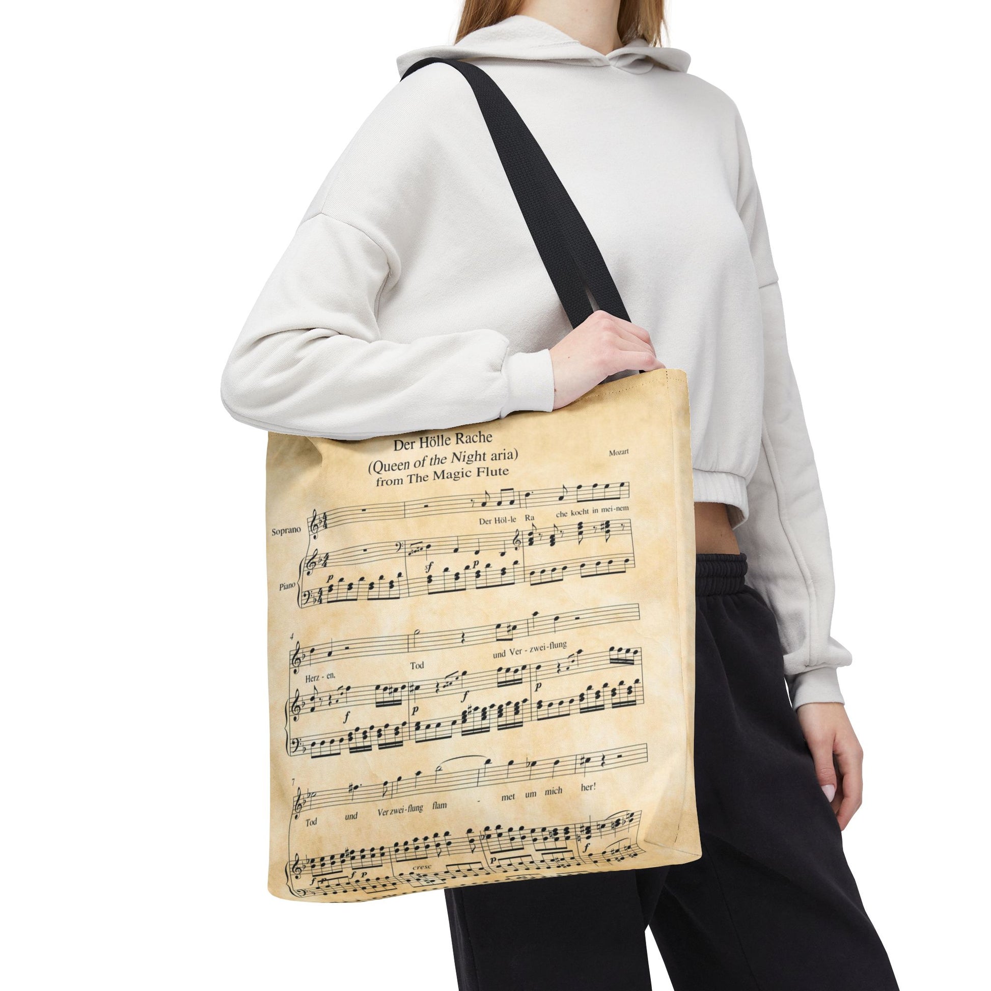 Express your opera passion with this Magic Flute tote bag featuring the music "Der Hölle Rache" from Act 2 of Mozart's symbolic opera! Sheet music accents a parchment colored background. Perfect gift for any opera lover on holidays and special occasions such as birthdays, graduations, and music festivals.