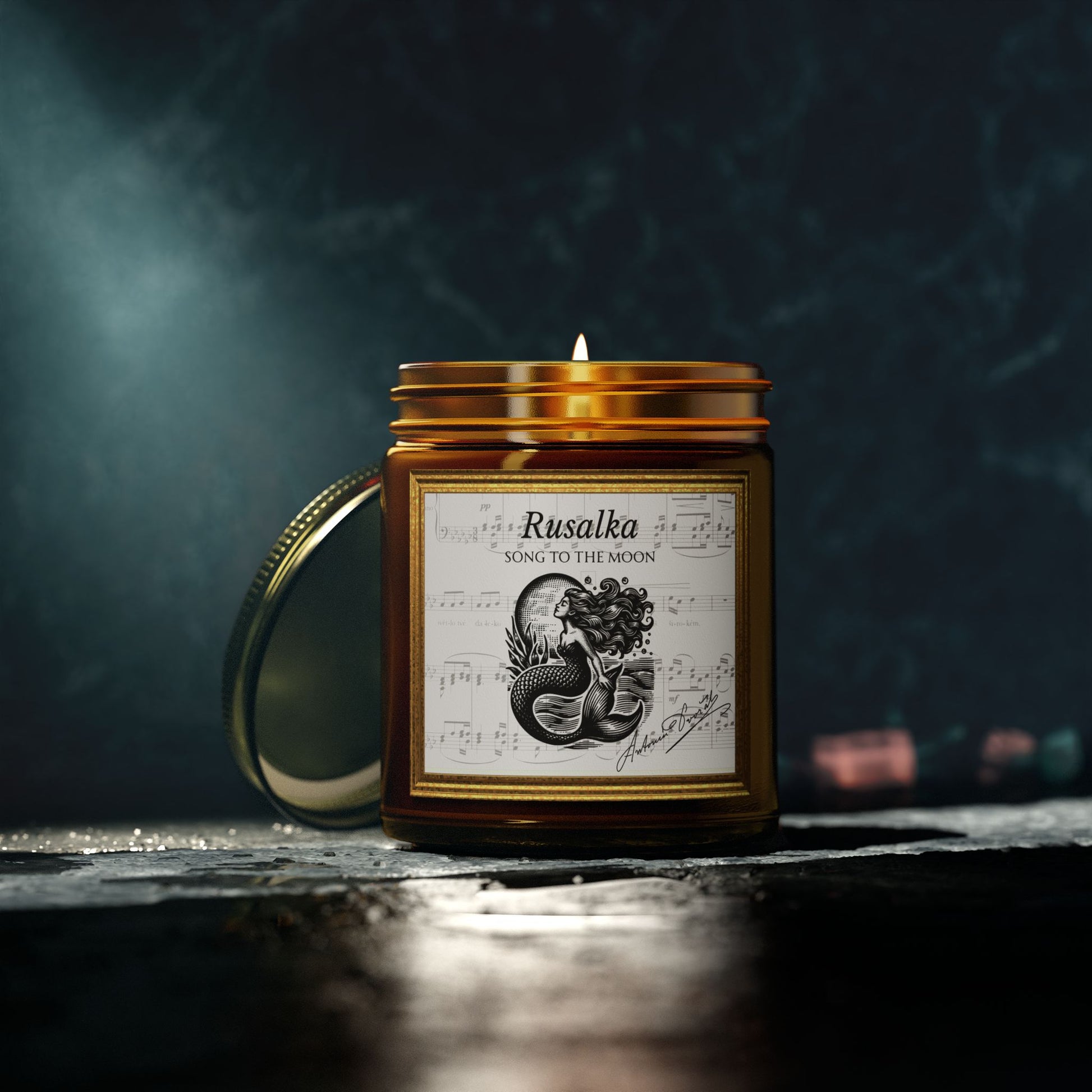 A perfect gift for opera lovers! This candle features Dvorak's "Song to the Moon" sheet music from his opera Rusalka. A design featuring a water sprite in front of a moon represents the beloved aria. Crafted from eco-friendly Coconut Apricot Wax, these candles are not only beautiful but also healthier for your home. Each candle offers delightful aromas like Fraser Fir, Cinnamon Chai, and Mango Coconut, creating an inviting atmosphere perfect for relaxation or gatherings. Unscented is also available for those with allergies or sensitivities to scents. With a burn time of up to 20 hours for the 4oz size and up to 50 hours for the 9oz size, you can enjoy these luxurious scents throughout the day and night. These candles make the perfect gift for holidays, anniversaries, or just to brighten someone's day. Celebrate life’s moments and elevate your ambiance with our scented candles!