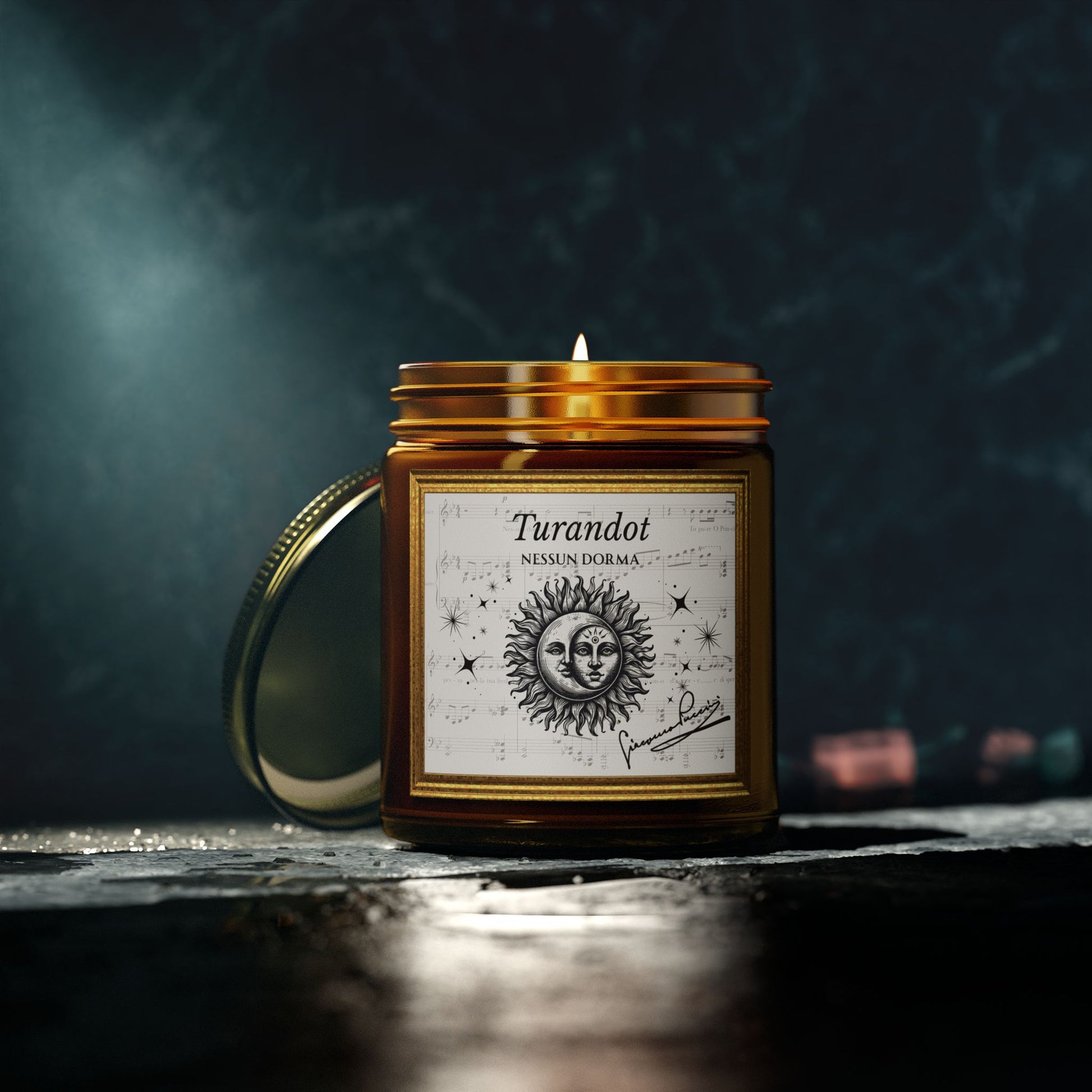 A perfect gift for opera lovers! This candle features Puccini's "Nessun Dorma" music from Act 3 of Turandot. The design represents celestail themes of the opera. In Act 1 the people await the rising of the moon. In the aria Nessun Dorma Calaf speaks of the stars and in the grand Alfano finale the people celebrate the glory of the sun and love. Crafted from eco-friendly Coconut Apricot Wax, these candles are not only beautiful but also healthier for your home. Each candle offers delightful aromas like Fraser Fir, Cinnamon Chai, and Mango Coconut, creating an inviting atmosphere perfect for relaxation or gatherings. Unscented is also available for those with allergies or sensitivities to scents. With a burn time of up to 20 hours for the 4oz size and up to 50 hours for the 9oz size, you can enjoy these luxurious scents throughout the day and night. These candles make the perfect gift for holidays, anniversaries, or just to brighten someone's day. Celebrate life’s moments and elevate your ambiance with our scented candles!