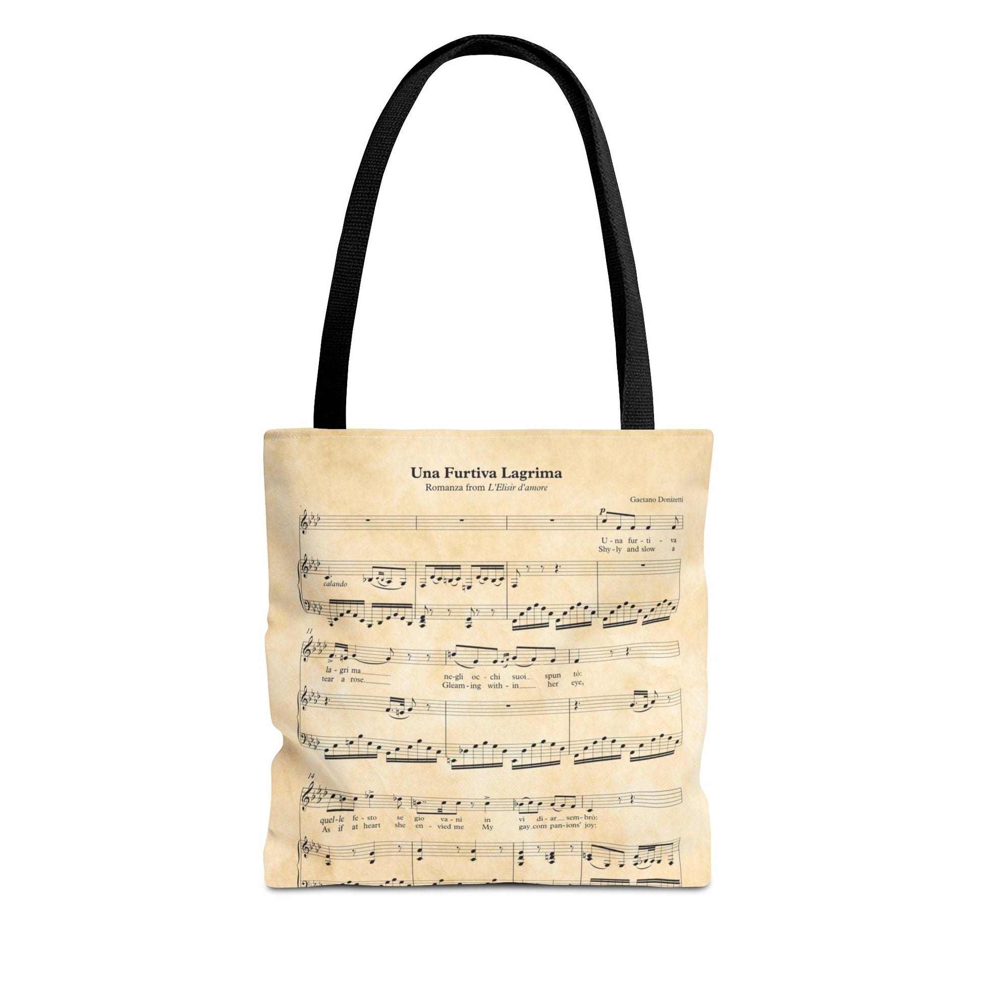Express your opera passion with this tote bag featuring Donizetti's " Una Furtiva Lagrima" from L'Elisir d'Amore! Sheet music accents a parchment colored background. Perfect gift for any opera lover on holidays and special occasions such as birthdays, graduations, and music festivals.